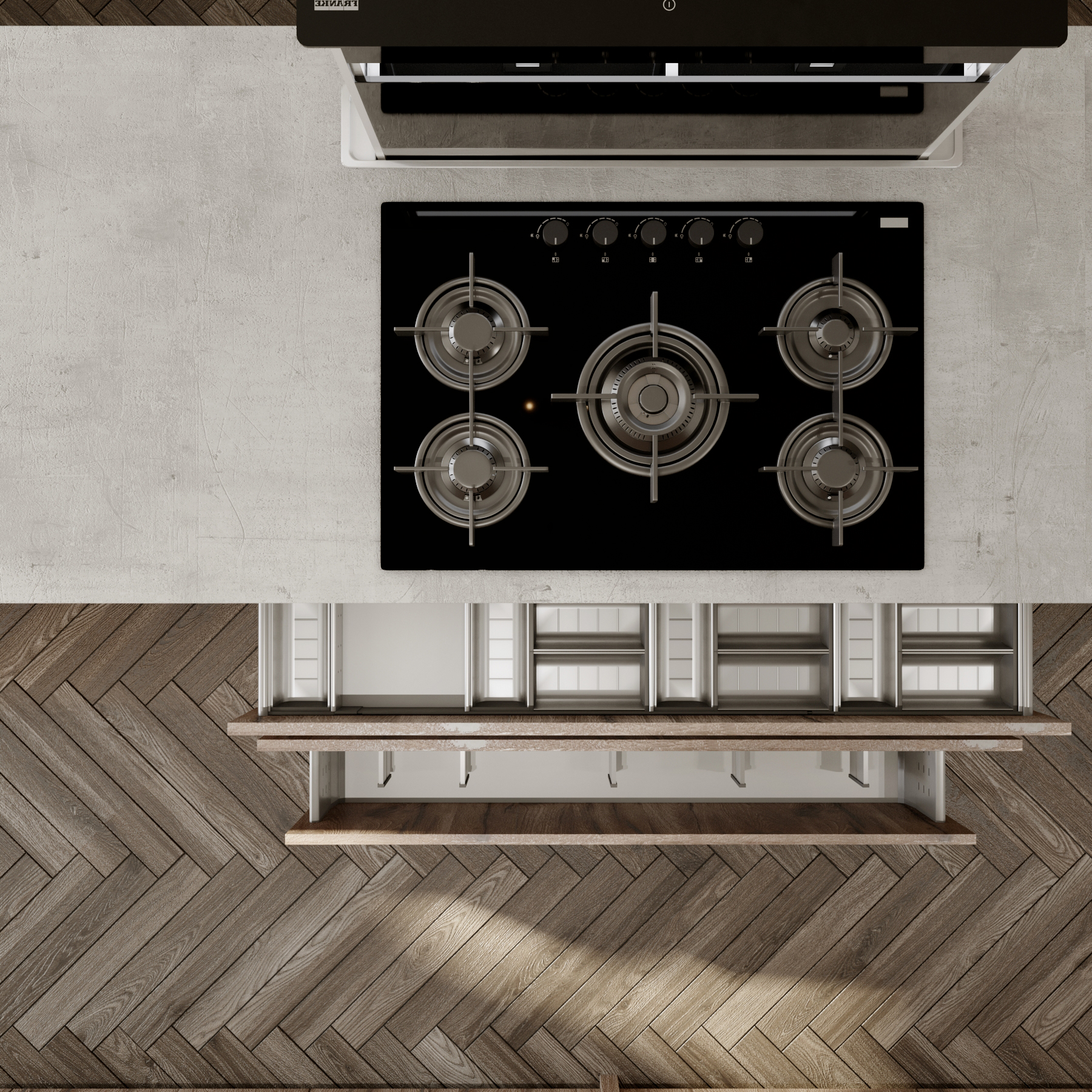 The shelves are made of imitation Egger wood for added style and durability, and the Fundermax kitchen worktop ensures not only the stylistic continuity of the ensemble, but also optimal functionality and the pleasure of using it every time.