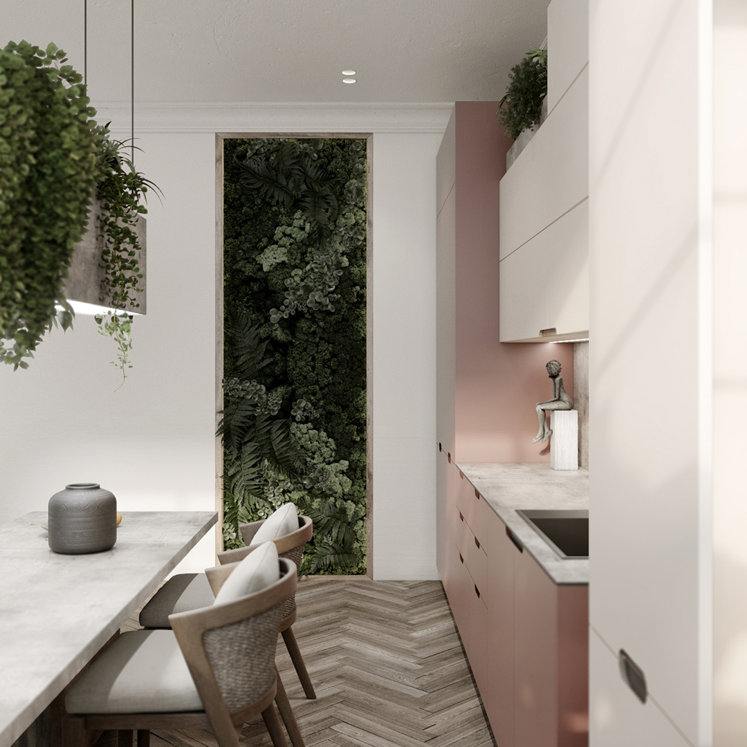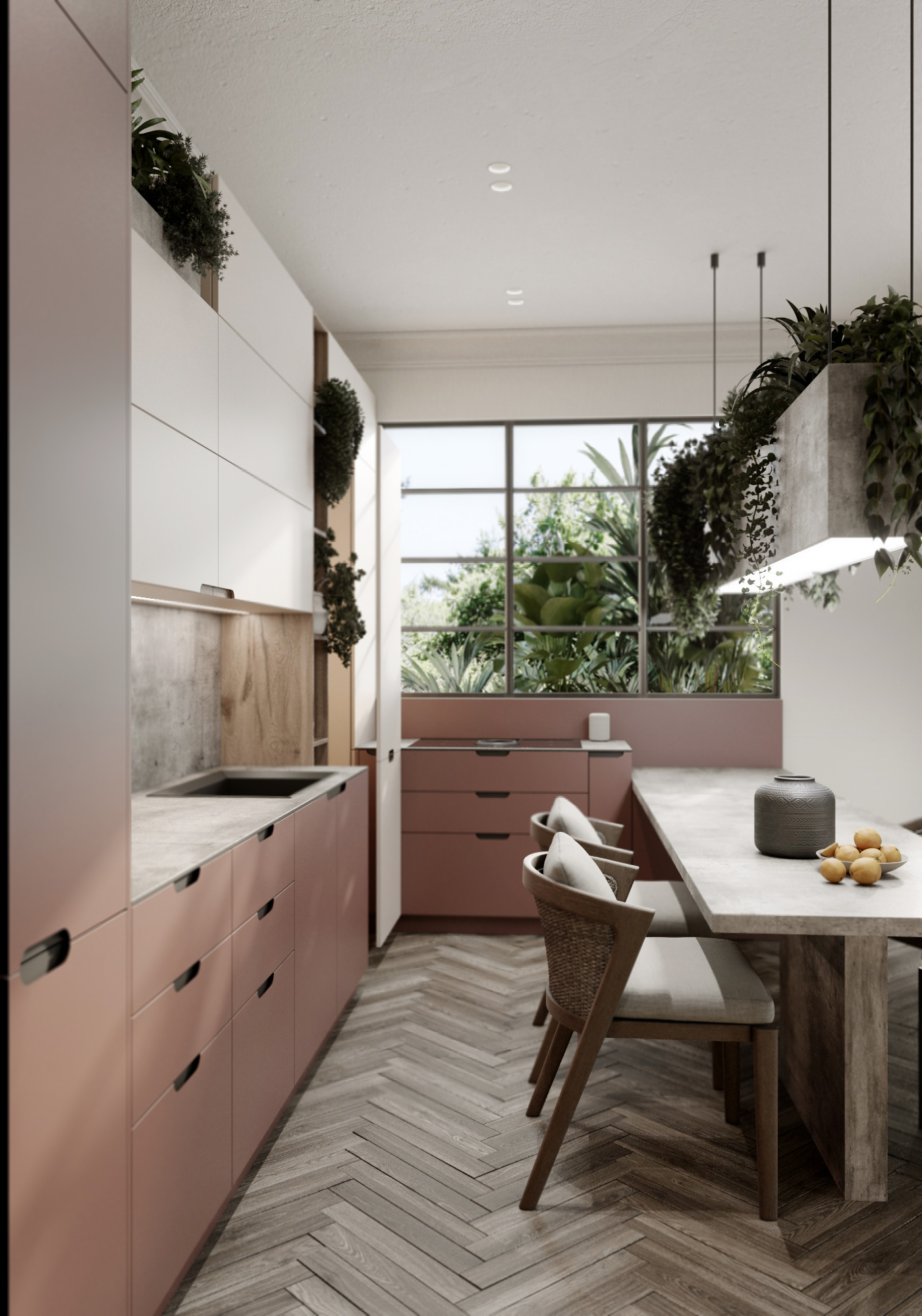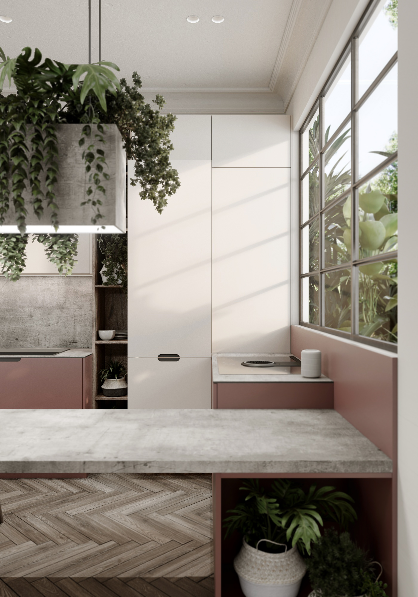 The combination of MDF and Egger for the leg, top and hood ensures the sturdiness of the ensemble, while the fresh mix of pink and white tones invigorates the entire room.