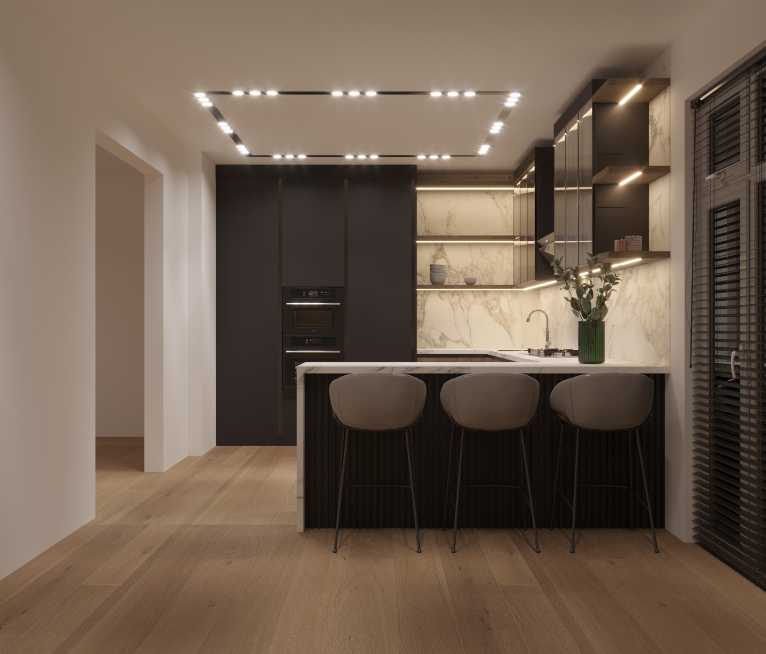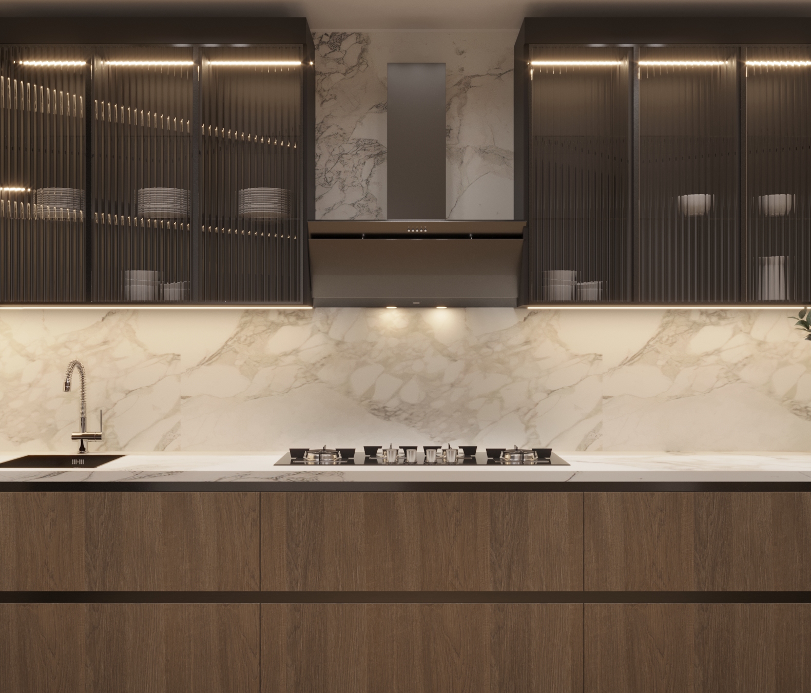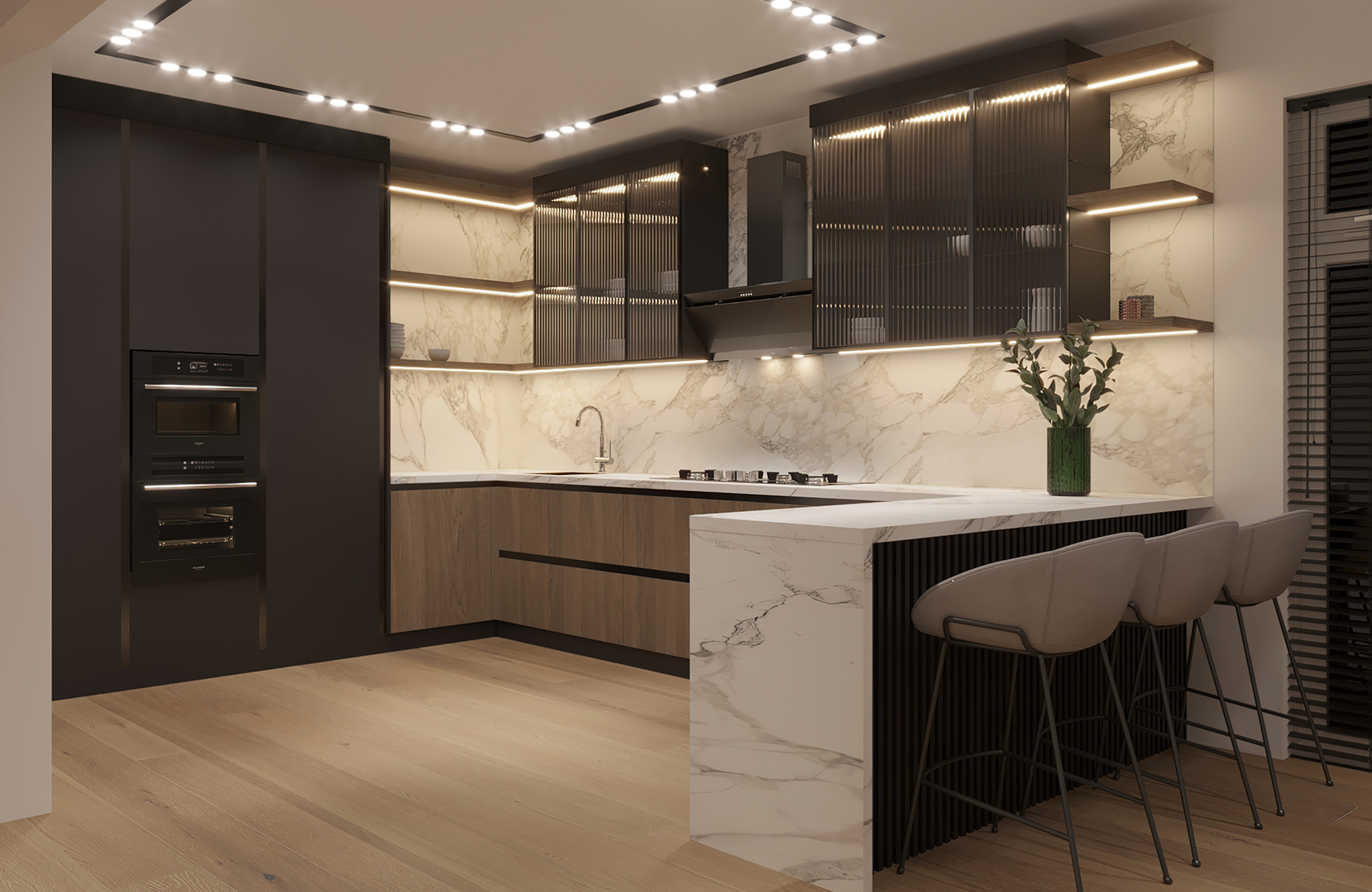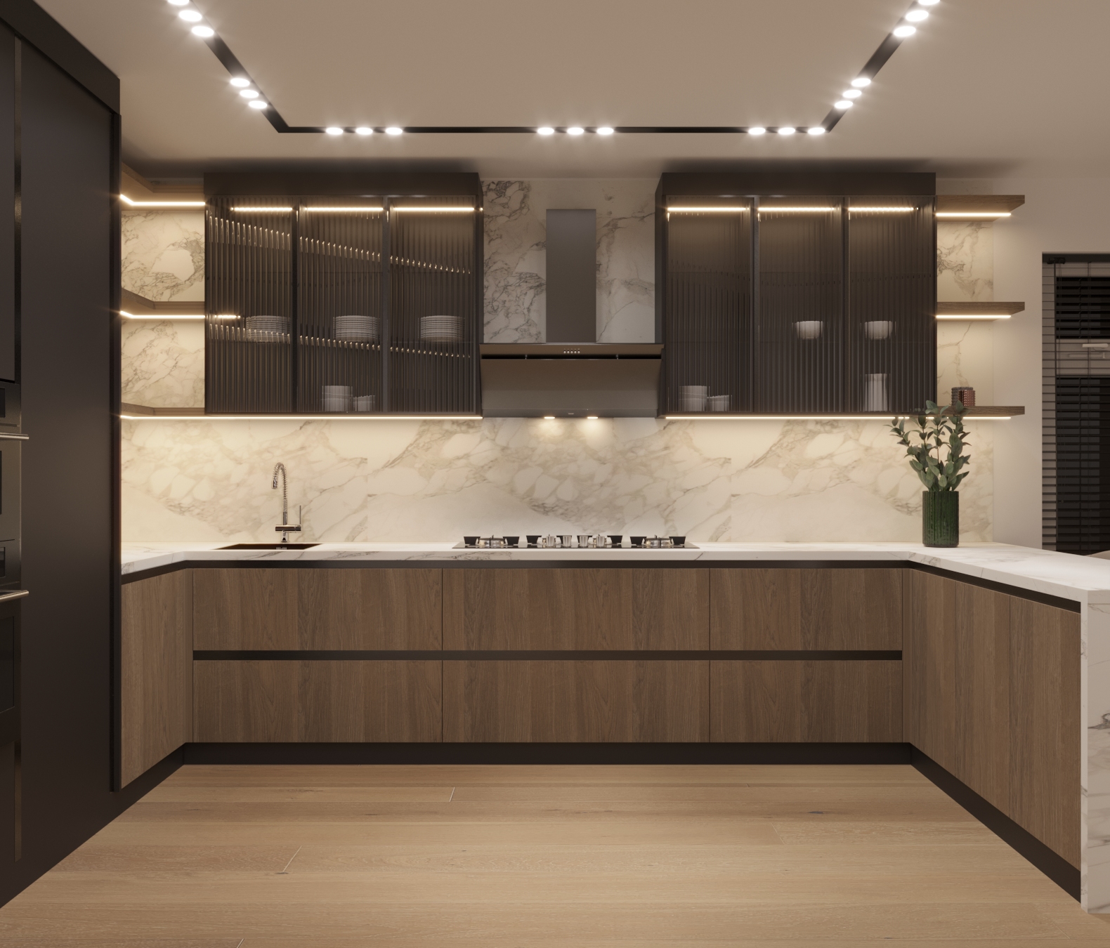 Vitrinele din sticlă riflata iluminate cu LED-uri integrate, adaugă o notă de modernism, iar blatul din ceramică cu aspect de marmură naturală oferă un contrast fascinant.