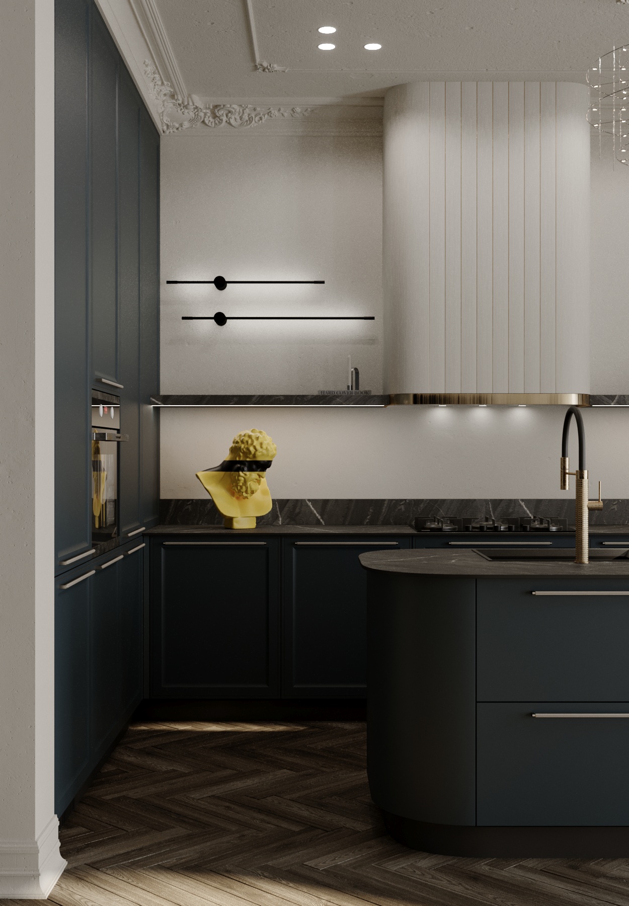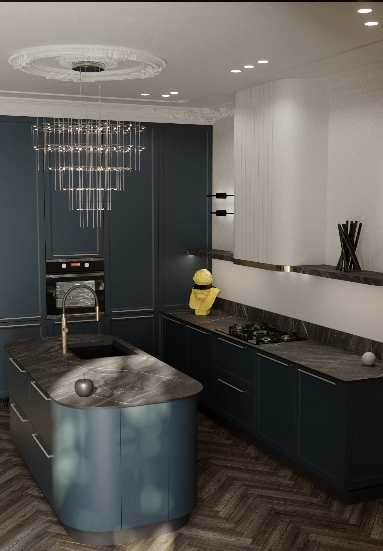 Această bucătărie este executată din Mdf vopsit în stil neoclasic combinată cu linii curbe la insula modernă de unde a și căpătat denumirea „eclectic”.