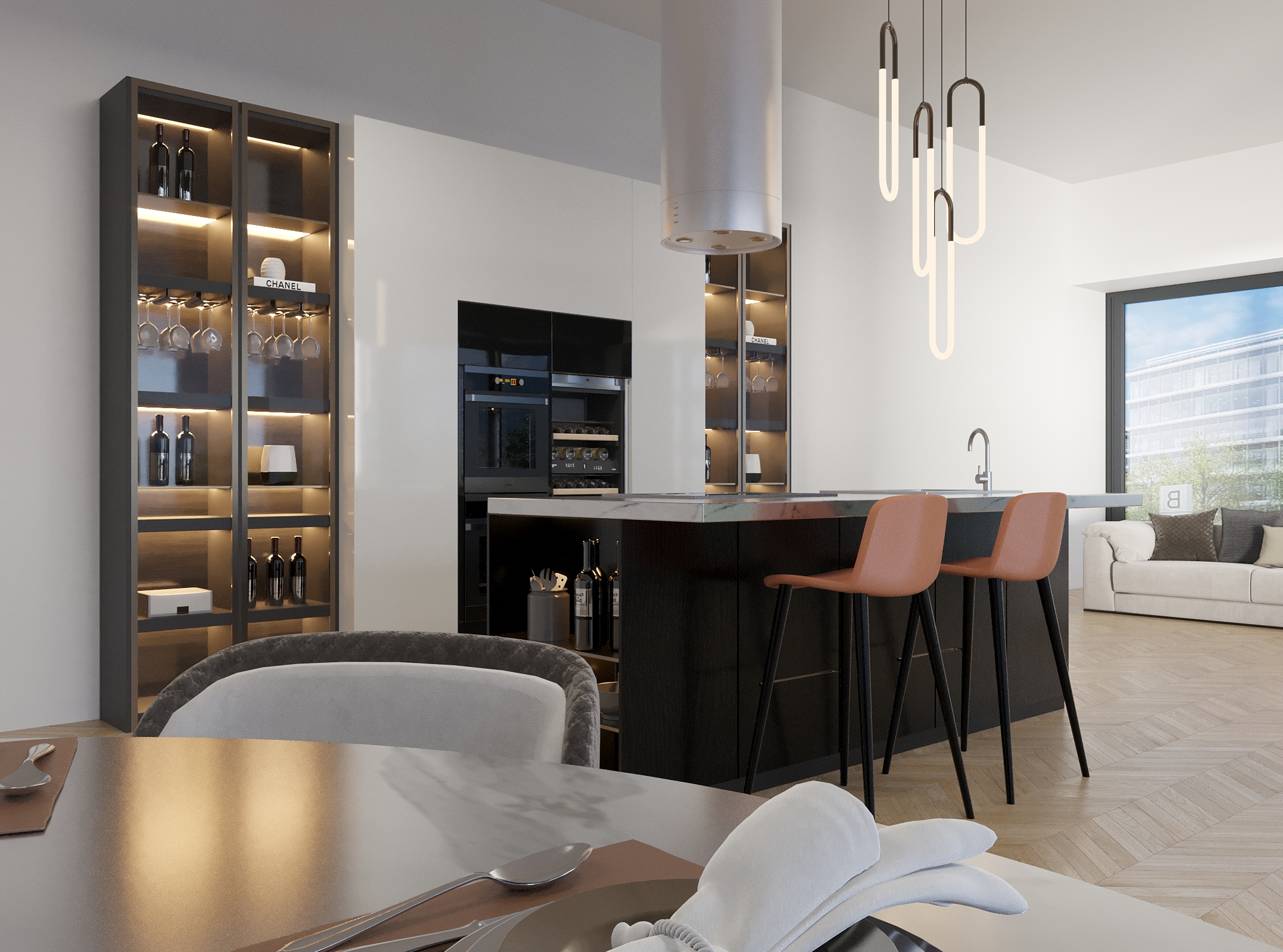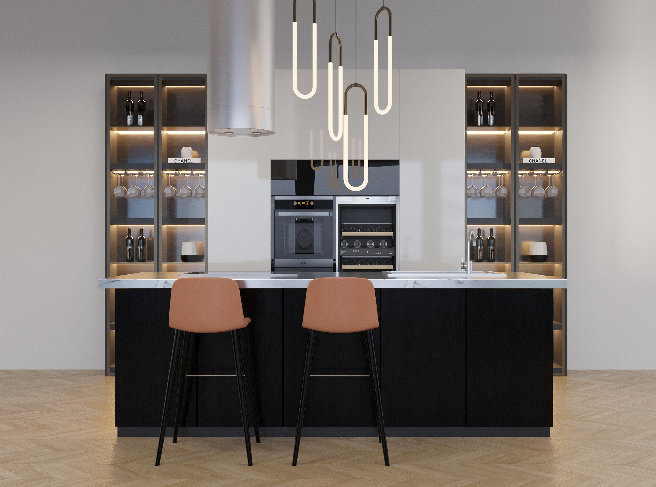 Descoperă eleganța și funcționalitatea absolută într-o bucătărie pe comandă, care îți va transforma casa într-un spațiu de rafinament. Fronturile din MDF melaminat alb lucios aduc lumină și prospetime în acest design, în timp ce vitrinele iluminate adaugă un farmec aparte și pun în evidență obiectele de valoare. Insula de lucru cu fronturi din MDF melaminat negru texturat adaugă o notă de contraste și rafinament. Cu un blat de ceramica elegant și durabil, imbinare la 45° și feronerie de înaltă calitate de la Hettich și mecanisme Kesseboehmer, această bucătărie pe comandă reprezintă perfecțiunea în fiecare detaliu. Bucură-te de spațiul generos și funcțional, în care pasiunea culinară prinde viață. Optează pentru o experiență premium în bucătăria ta personalizată.