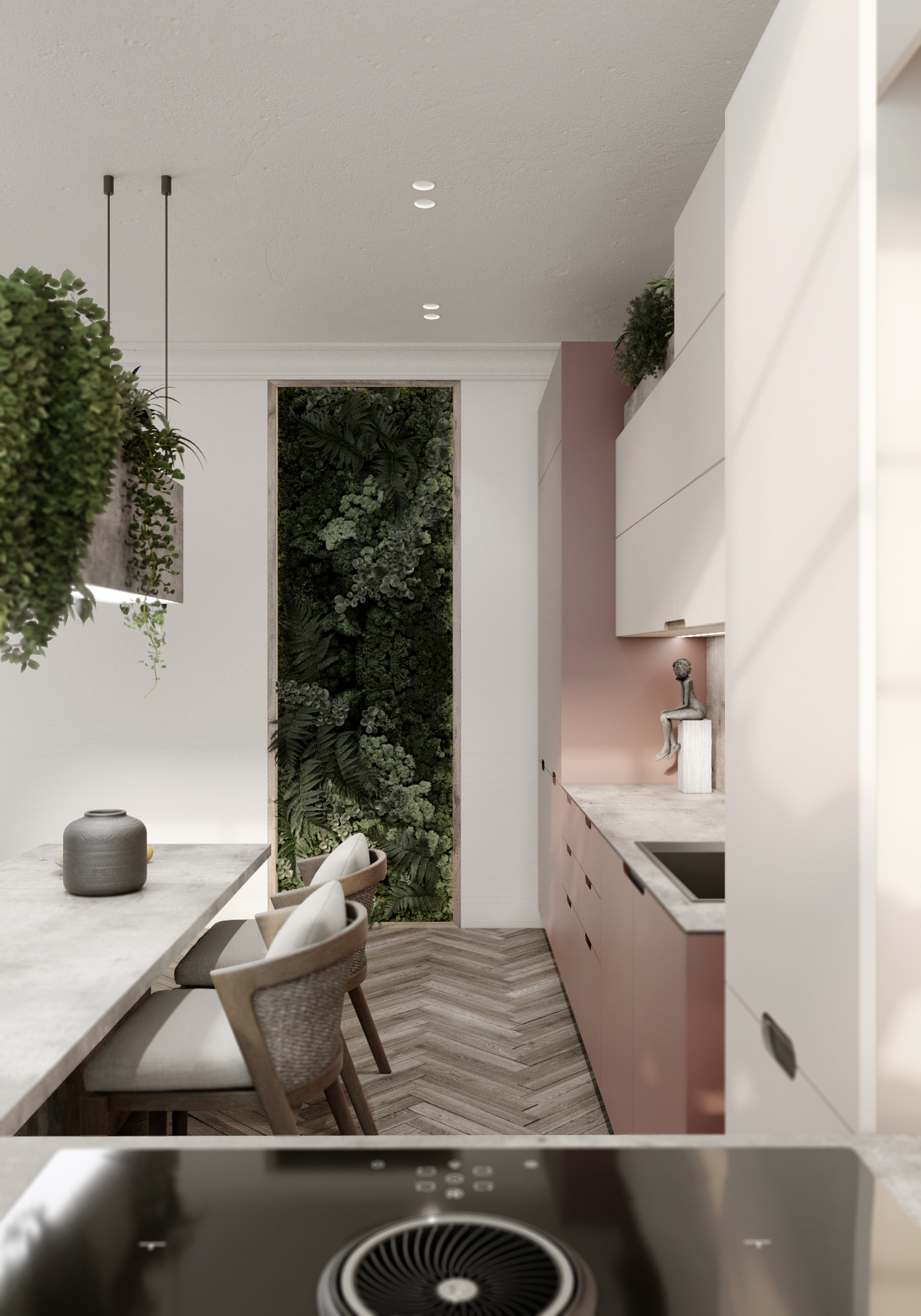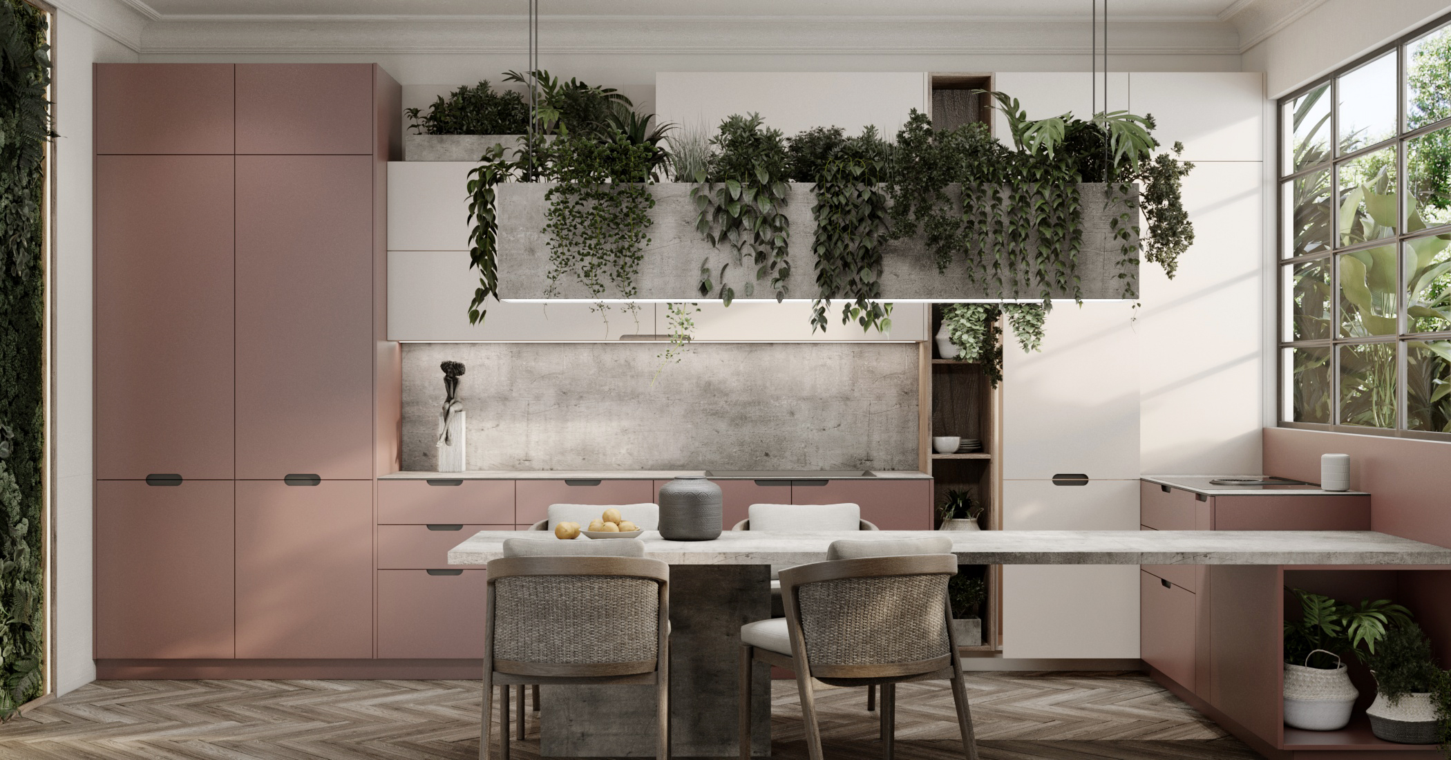 Combinația de MDF și Egger pentru partea de picior, blat și hotă asigură robustețea ansamblului, în timp ce mixul fresh de nuanțe de roz și alb revigorează întreaga încăpere.