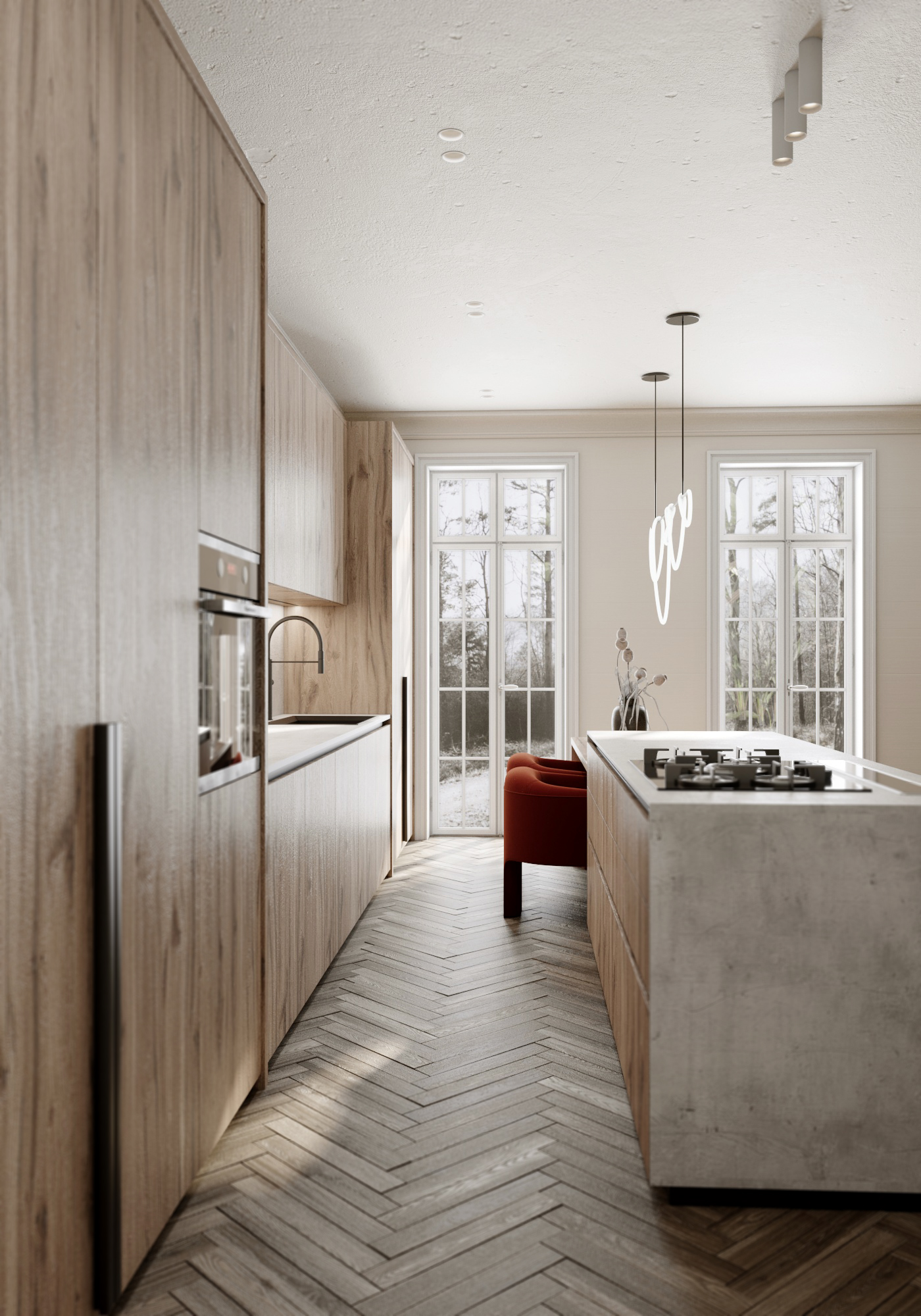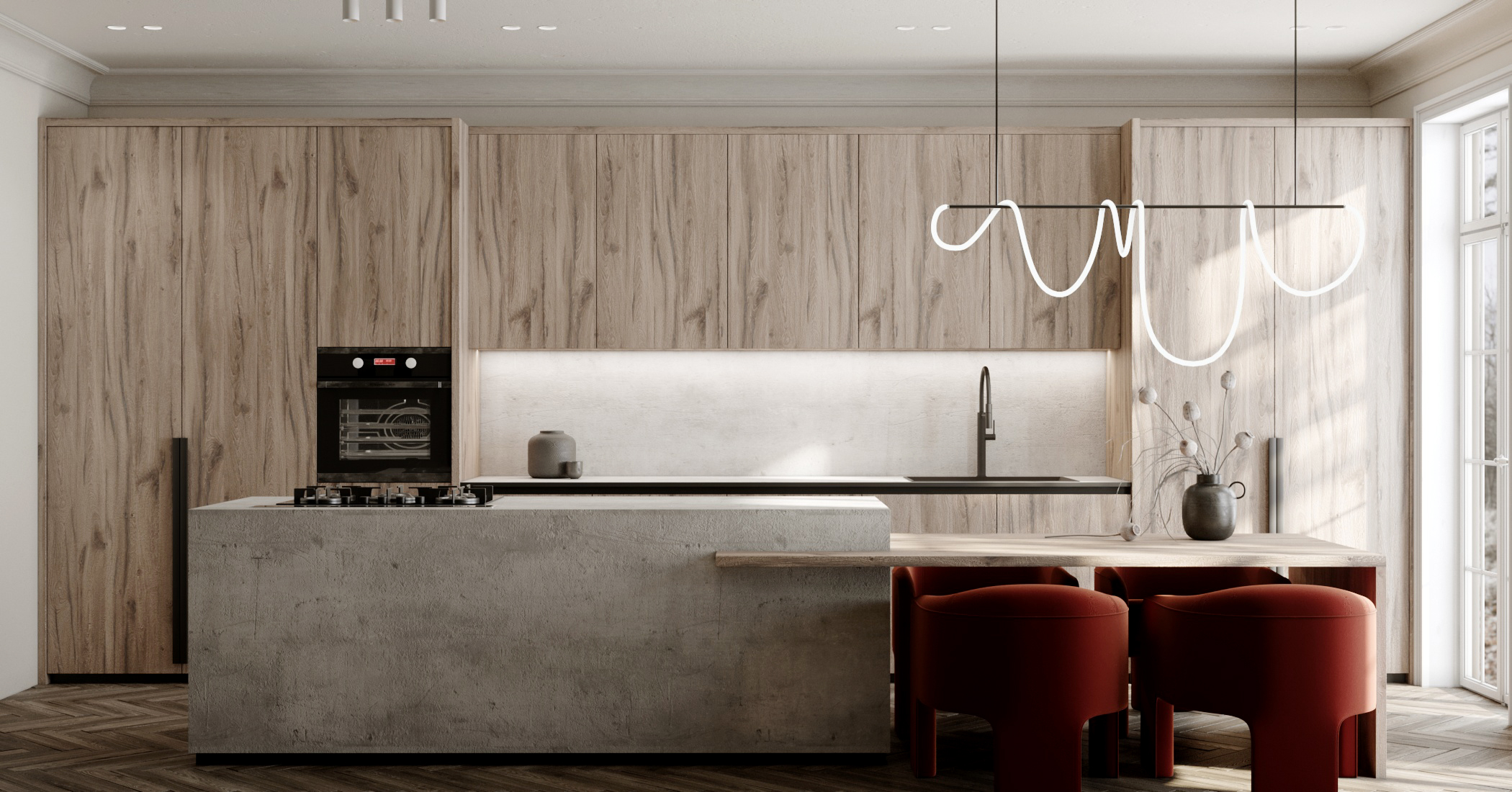 Fronturile Cleaf imitație de lemn și beton surprind excelent caracterul ultra-modern al bucătăriei și, alături de blatul și contrablatul din Fundermax, compun un ansamblu compact în care totul este armonios articulat.